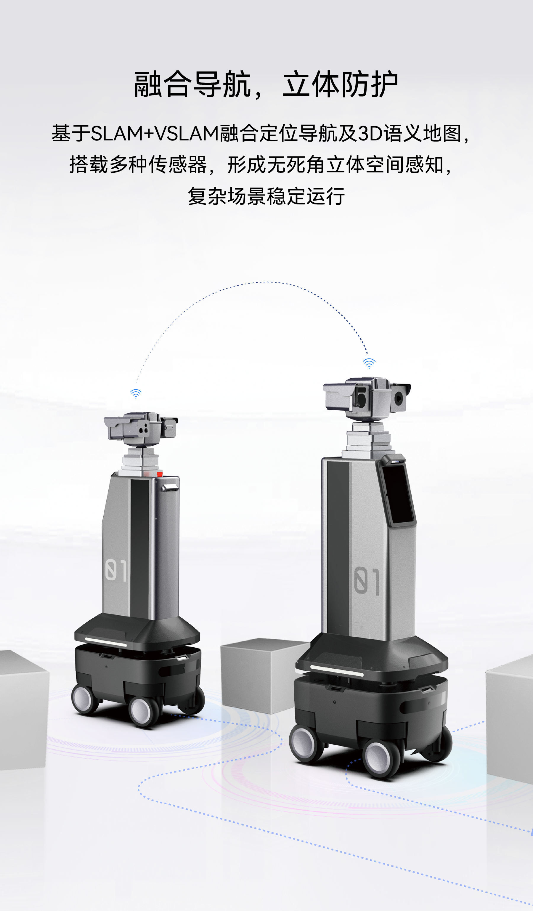 基于SLAM+VSLAM融合定位导航及3D语义地图,搭载多种传感器,形成无死角立体空间感知,复杂场景稳定运行